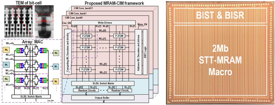 该工作面向资源受限的边缘人工智能设备,解决了新型非易失磁存储器STT-MRAM存算电路自下而上设计中的挑战。东南大学团队研制了一款28nm 2Mb的高能效STT-MRAM存内计算芯片,在1-bit输入/1-bit权重/9次累加/5-bit输出的情况下,实现了高达41.5 TOPS/W的峰值能效,以及96.2%(MNIST数据集)的网络推理精度,是中国大陆首篇在ISSCC上发表的MRAM存储与存算工作。该工作以《A 28nm 2Mb STT-MRAM Computing-in-Memory Macro with a Refined Bit-Cell and 22.4 – 41.5 TOPS/W for AI Inference》为题,文章第一作者为东南大学集成电路学院蔡浩副教授。