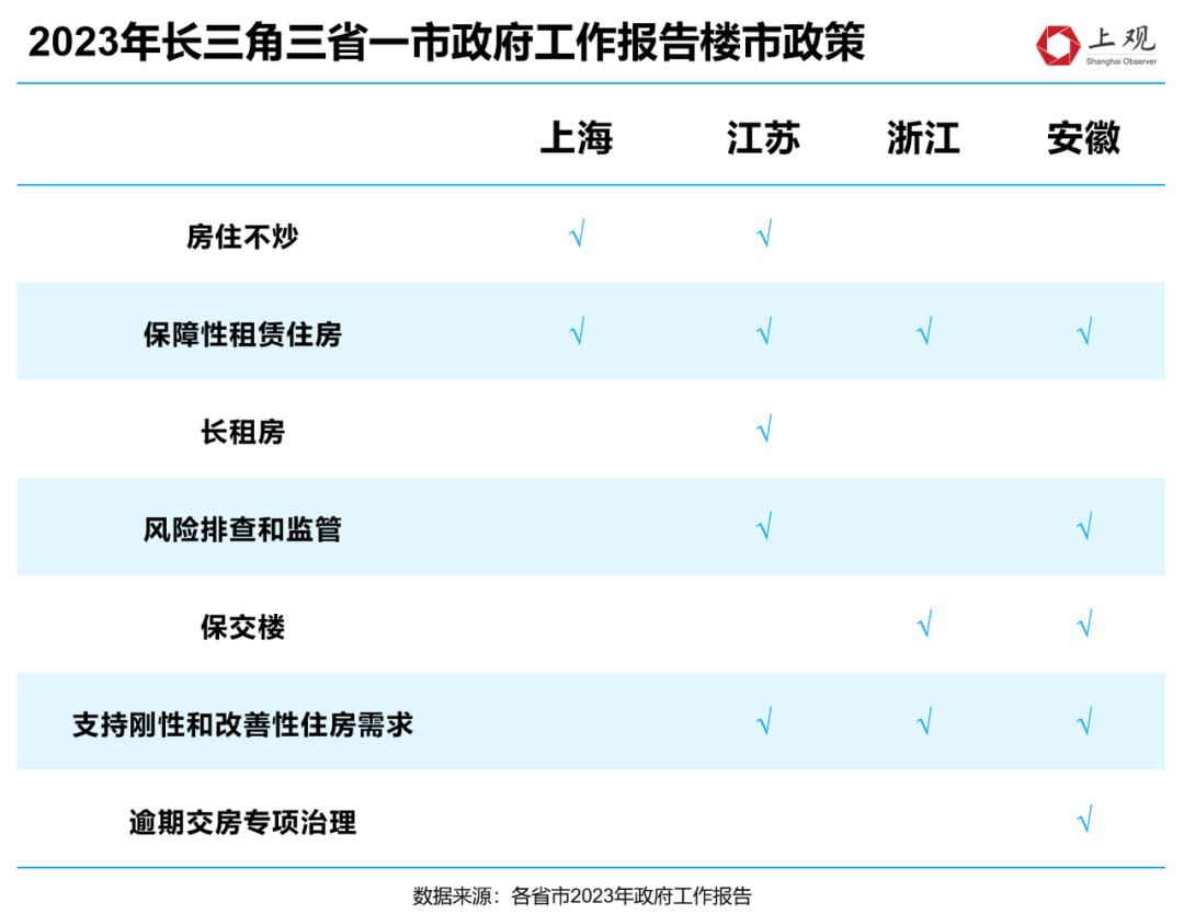 上海和江苏再次强调了“房住不炒”的原则;江苏和安徽都表示要加强房地产市场的风险排查和监督,加强商品房预售资金、交付质量、物业管理等监管;浙江和安徽明确提出了“保交楼”目标,安徽还特别强调了对房地产开发项目逾期交房的专项治理,全力保民生、保稳定。