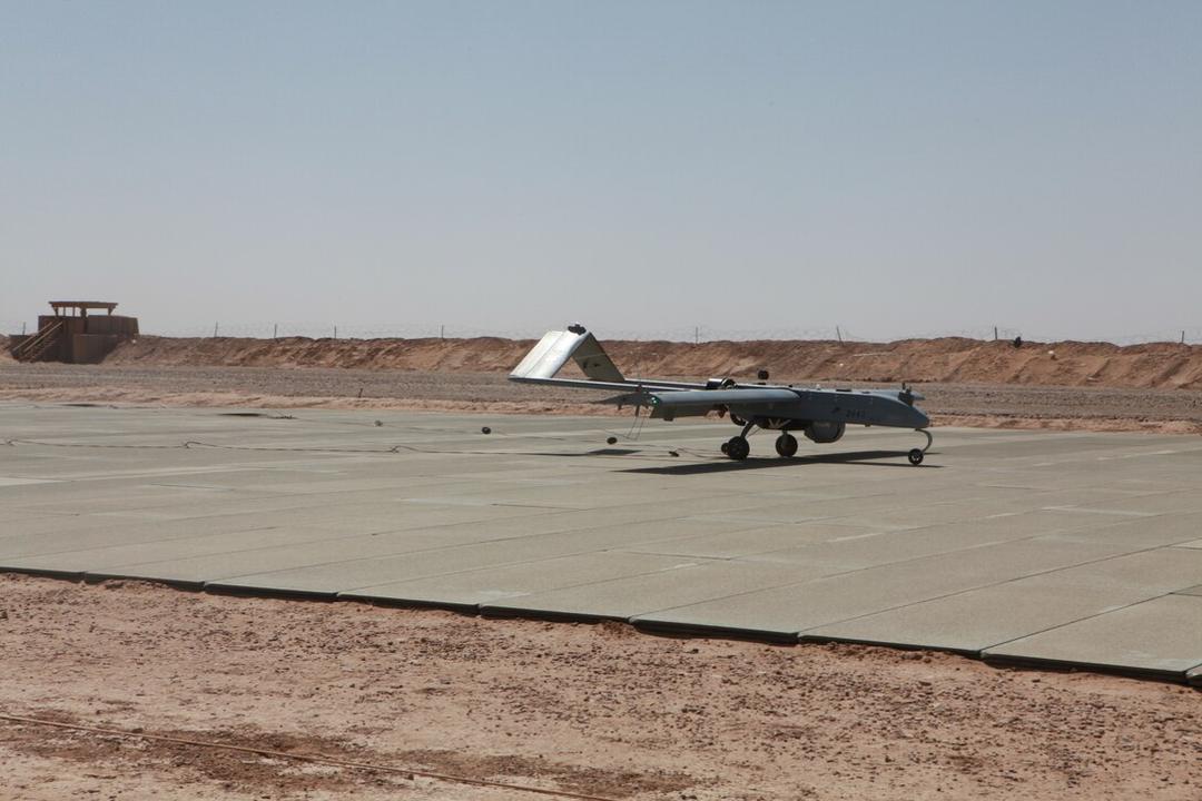 图为2011年时部署在阿富汗的美国海军陆战队RQ-7B无人机的降落瞬间。在跑道降落后滑跑,最终通过尾钩钩挂上拦阻索停了下来。