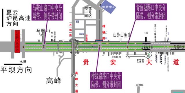 樱花季期间贵安大道青鱼塘路口、马鞍山路口、樟缘路路口双向侧分带及中央绿化带将进行封闭: