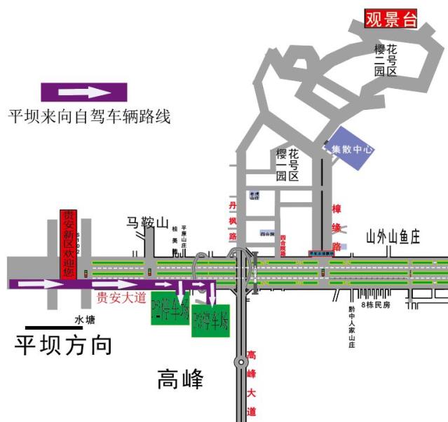 (三)由平坝方向自驾行驶至贵安樱花园停车场的车辆可从贵安大道小河湾路口进入辅道行驶至贵安樱花园黄猫村停车场或贵安樱花园振鑫停车场;返程路线:贵安大道辅道(西向东)-马场特大桥桥下掉头-平坝。