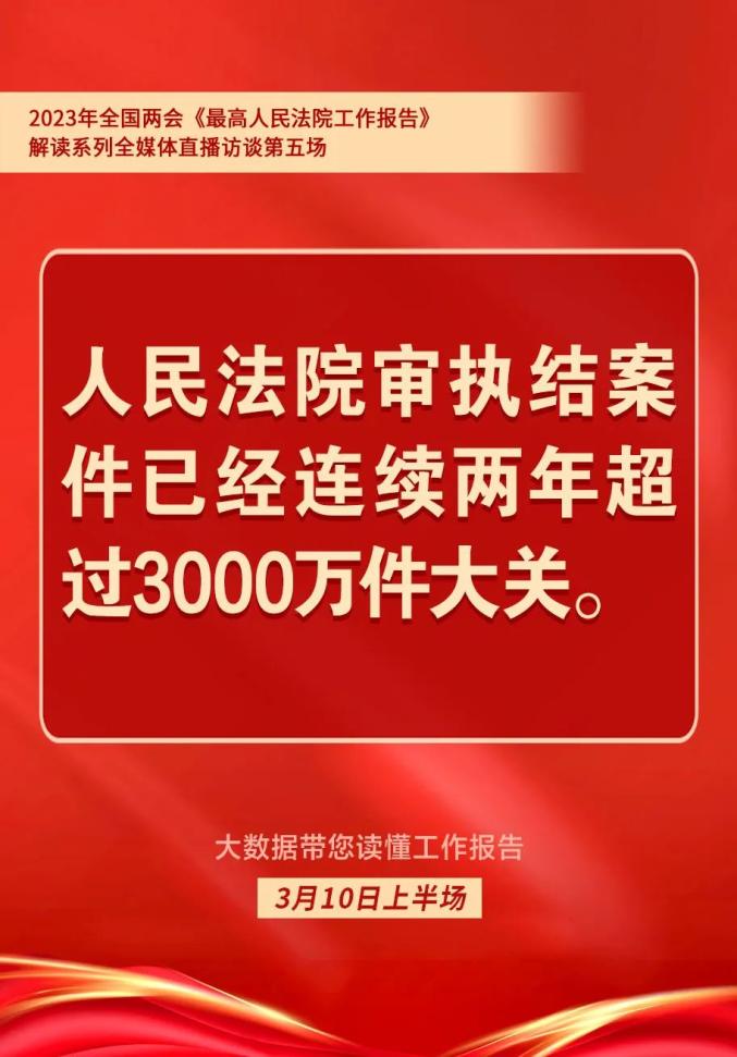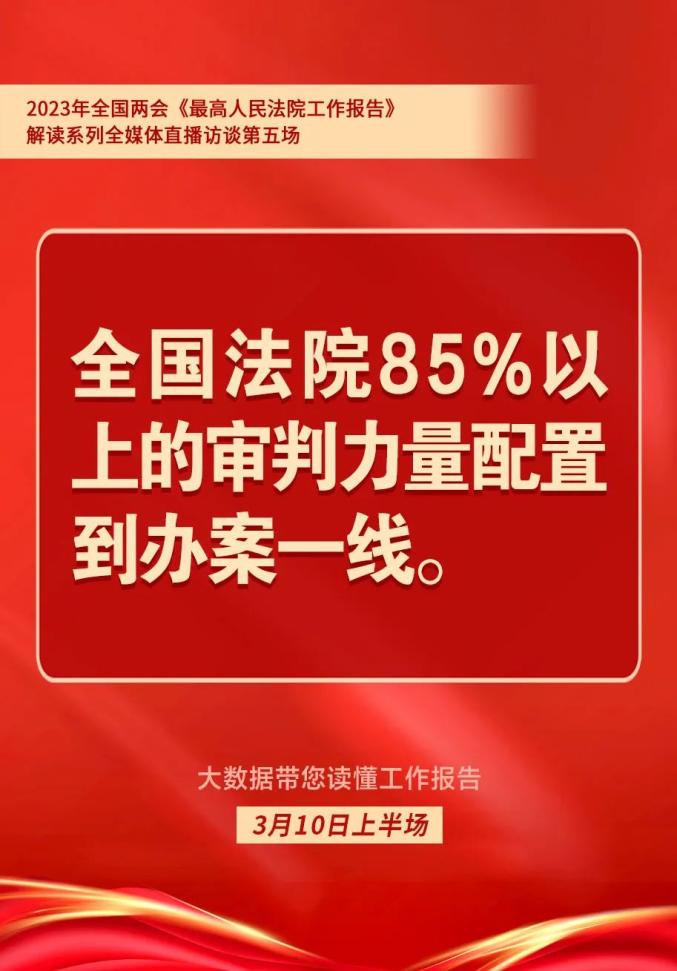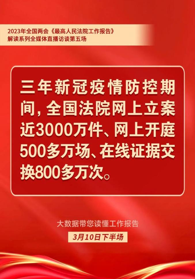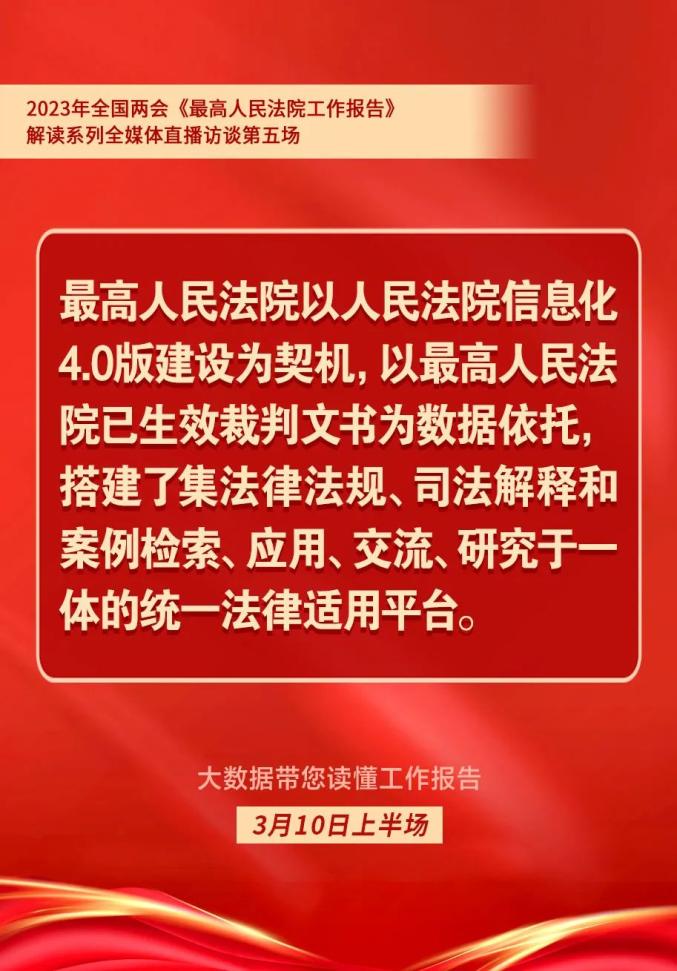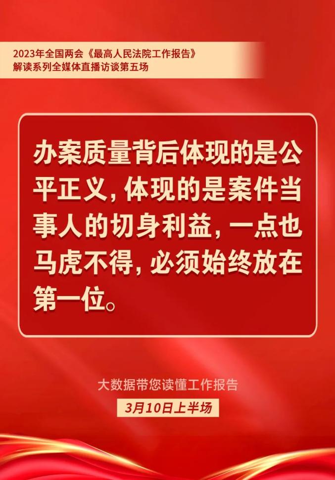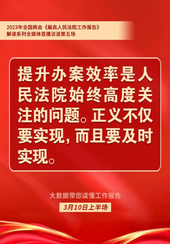 今天上午,最高人民法院举办2023年全国两会《最高人民法院工作报告》解读系列全媒体直播访谈第五场活动,最高人民法院审判管理办公室主任廖向阳、最高人民法院信息中心副主任陈奇伟在线解读工作报告。