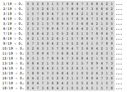 从 1/19 到 18/19 这 18 个分数的小数循环节长度都是 18。把这 18 个循环节排成一个 18×18 的数字阵,恰好构成一个幻方——每一行、每一列和两条对角线上的数字之和都是 81 (注:严格意义上说它不算幻方,因为方阵中有相同数字)。196 算法