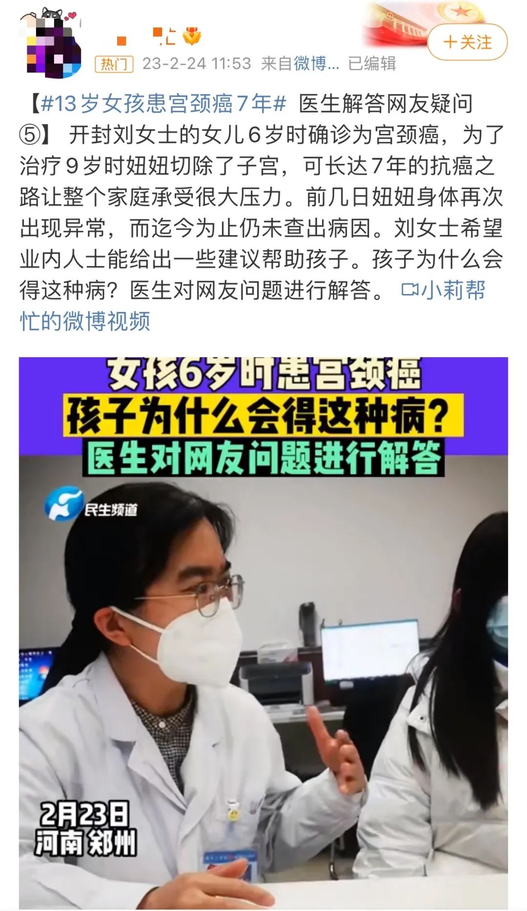 郑州有一名13岁的小女孩,6岁时就被诊断出宫颈癌,并切除子宫,今年身体又出现了异样,截至2月底仍未查出病因。