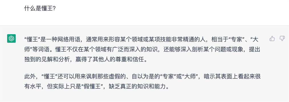 然而,不可忽视的是,ChatGPT也有很多局限。就其所生成的内容而言,最为突出的问题在于,ChatGPT有时会提供貌似合理但却与事实不符,甚至是荒谬的答案,这一点也得到了OpenAI的承认。正如ChatGPT对“什么是‘懂王’?”这一问题的回答一样——