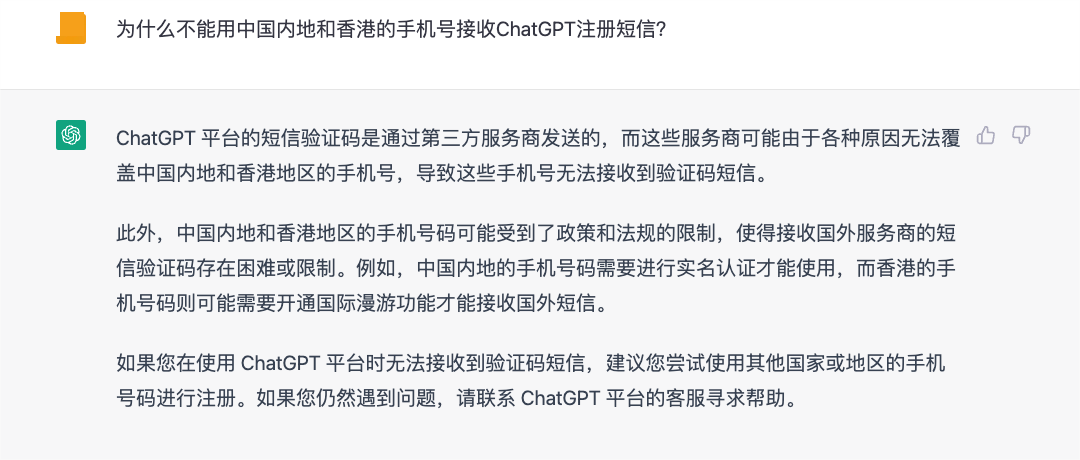 一个有趣的现象,当我国用户无法通过国内网络连接到ChatGPT官网的同时,ChatGPT也无法通过中国内地和香港的手机号接收注册短信。就这一问题,ChatGPT给出的回答是由于电信运营商的限制。然而这种看似默契的“双向奔赴”,暴露出我国可能面临的新型技术脱钩风险,即外国高技术企业可能会以监管限制为由,将我国排除于技术应用的范围之外,导致我国普通用户无法分享到技术进步的红利,科技创新领域从业人员研发成本的增加,更为广泛地抑制我国创新活力。