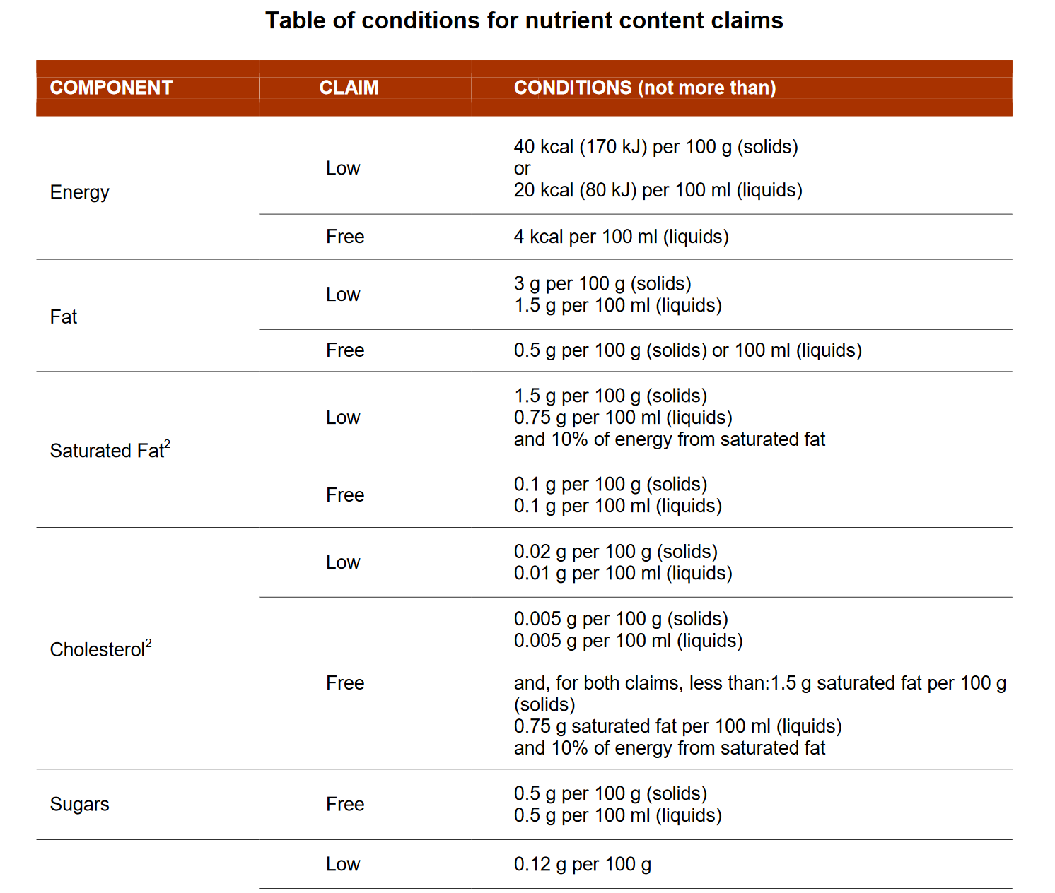 CAC在1997年发布了Guidelines for Use of Nutrition and Health Claims(CXG 23-1997),最新一次修订在2013年,其中对糖的含量宣称条件是,“无糖”指每100g(固体)或每100ml(液体)中含糖量不高于0.5g。