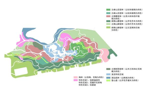 其中,双子山北坡主要体现春景和秋景,坡脚及上山登高步道两侧种植特色花灌木,坡面上种植大量的色叶乔木,加强秋季观赏效果,形成郁郁葱葱的七彩森林、层林尽染的效果;南坡在强调秋季景观效果的基础上,注重植物的四季变化。