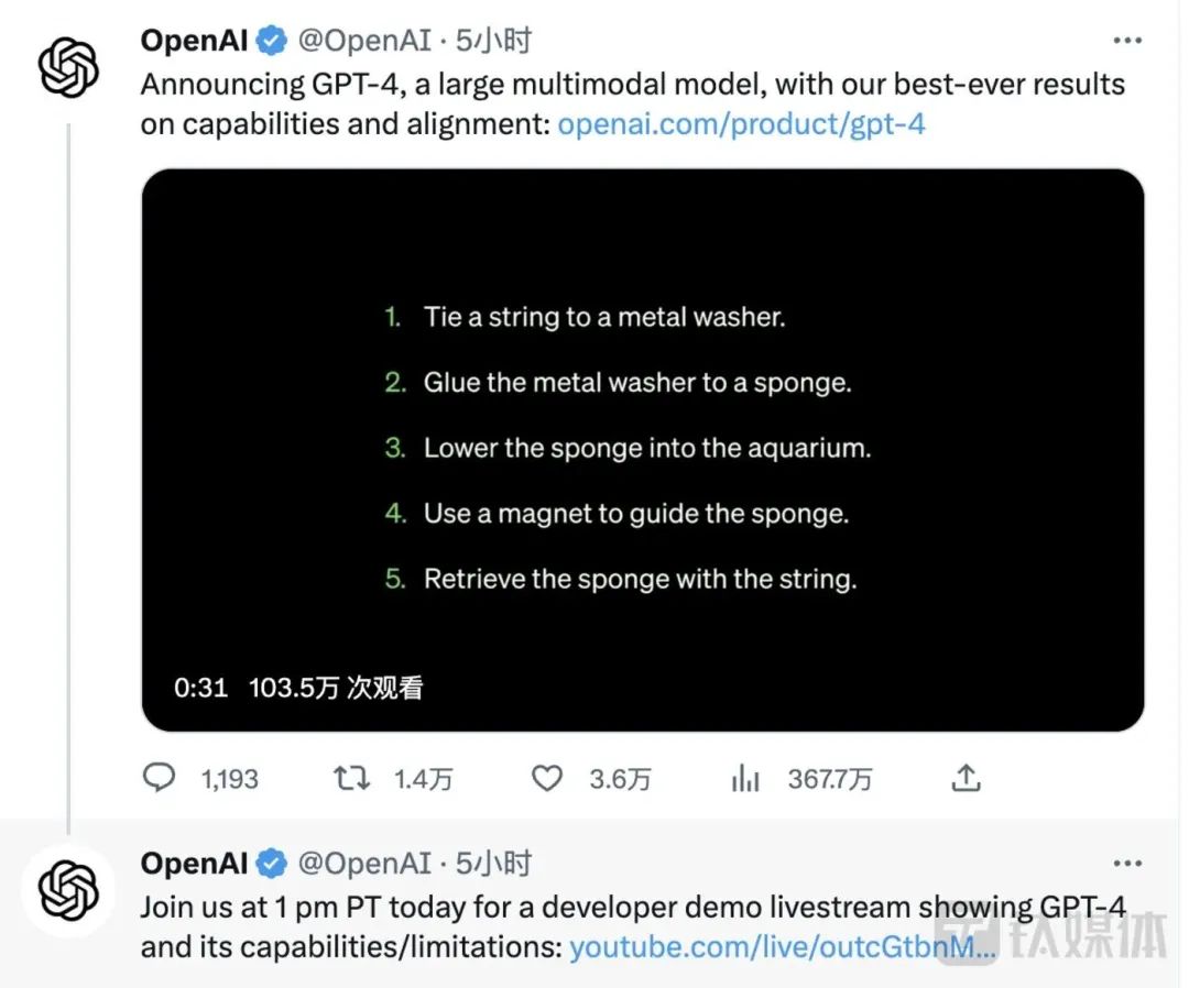 这一消息引发了 AI 技术圈内热议。短短五个小时,GPT-4推文阅读量超过367万。
