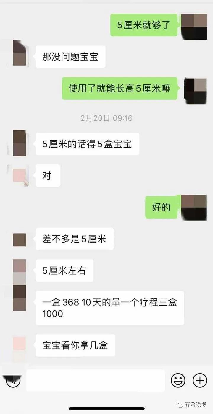 在微信聊天中,对方给小新发来了详细的产品介绍:小分子高活性,吸收程度是钙的五六倍,不含任何激素,没有副作用……小新将信将疑发问,“这个是可以让我长高,是吗?”对方说,吃5盒就能长高5厘米左右。紧接着对方给出了价格:一盒368元,能吃10天,一个疗程3盒,售价1000元……