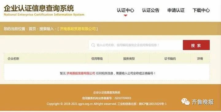 文章还提到,2022年7月公司被评选为中国3·15诚信企业。不过记者在企业认证查询系统搜索,显示并无该公司相关信息。