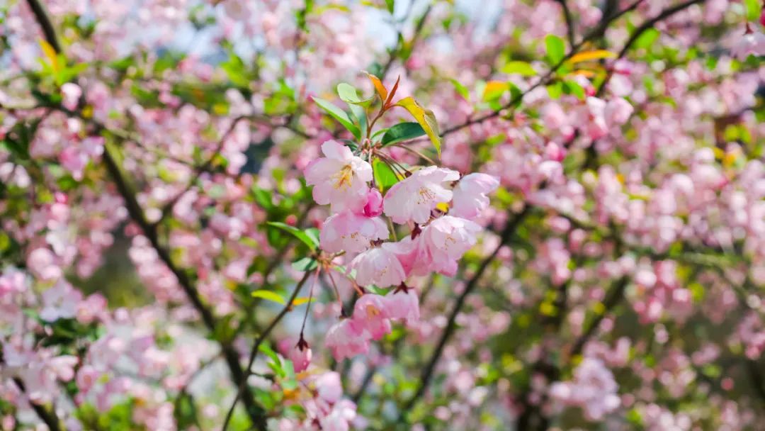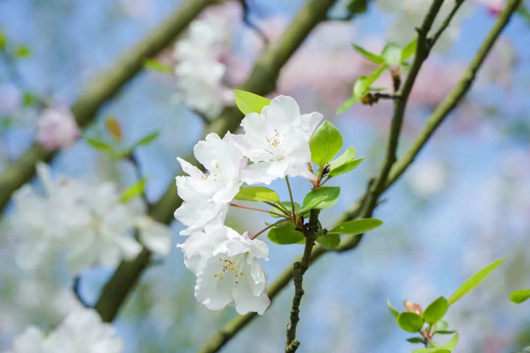 杉坪景区的海棠花,白中带粉的花朵挤满枝头,如胭脂点点,粉嫩欲滴,尽显春日的清新浪漫。