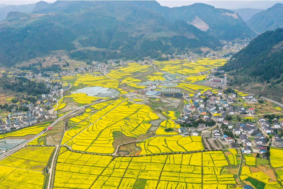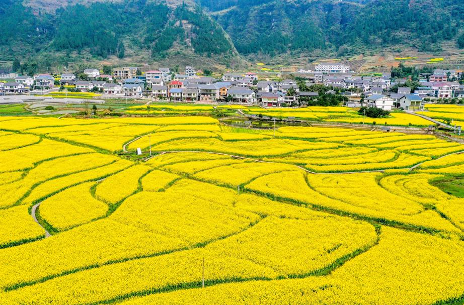 阳春三月,油菜花开。在务川自治县黄都镇万元村东山坝区,上百亩油菜花次第开放,金浪涌动,花香袭来。