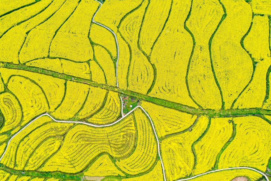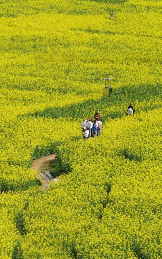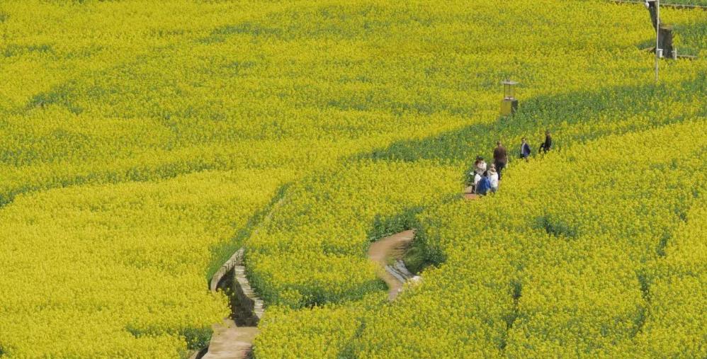 千丘园的油菜花竞相绽放,花群成海,流金四溢,绵延数十里,在微风的吹拂下金浪翻滚。