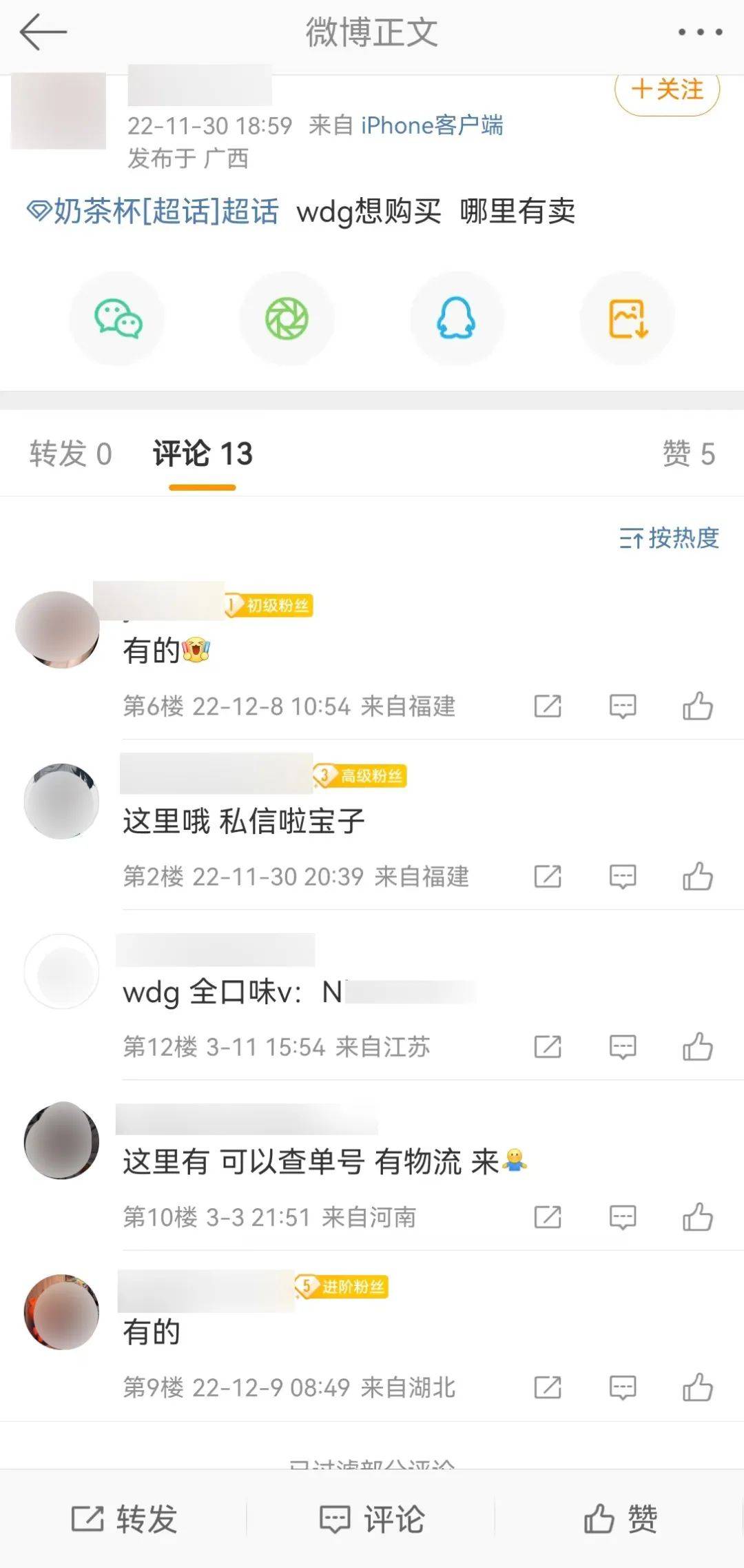 除此之外,微博也是卖家的聚集地。在微博搜索“WDG奶茶杯”,“有货、私聊、加V”是出现最多的评论。