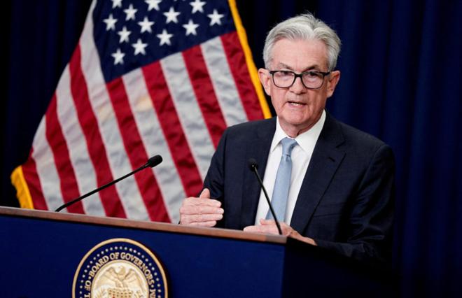 图为美联储主席鲍威尔在宣布将继续加息