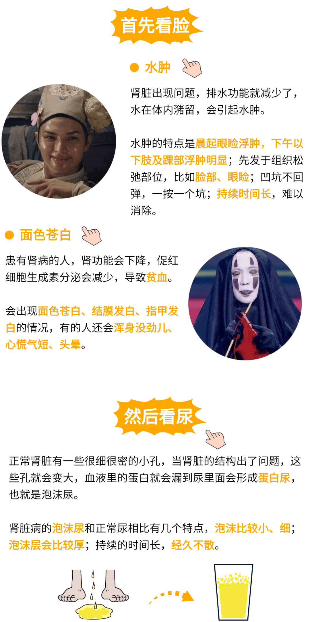如果发现自己脸不对劲,有水肿、苍白的迹象,尿液出现异常,那就得小心是不是肾出了问题。要是有恶心、呕吐、食欲不振,无明确原因的腰背酸痛等,也要警惕早期肾脏病的可能。这时候就得预约医生,明确病因,对症治疗了。