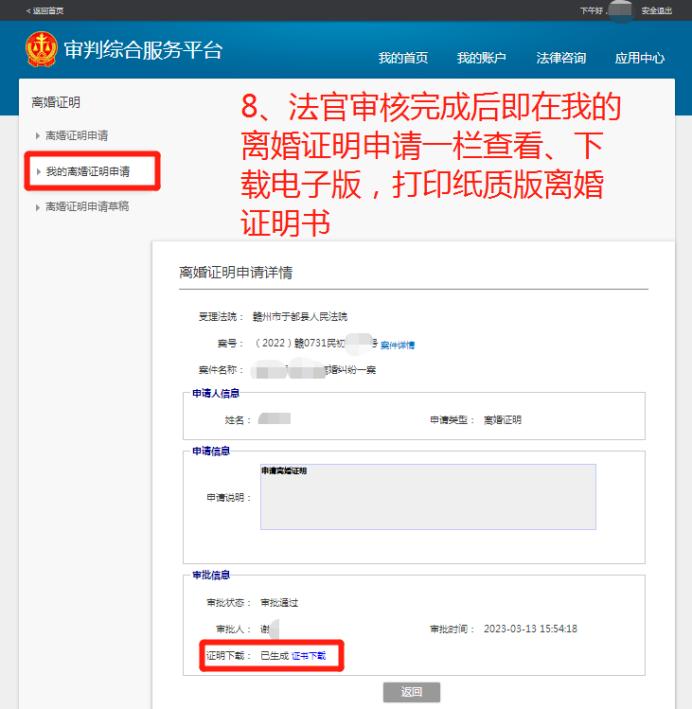 08在“我的离婚证明申请”一栏查看、下载电子离婚证明书
