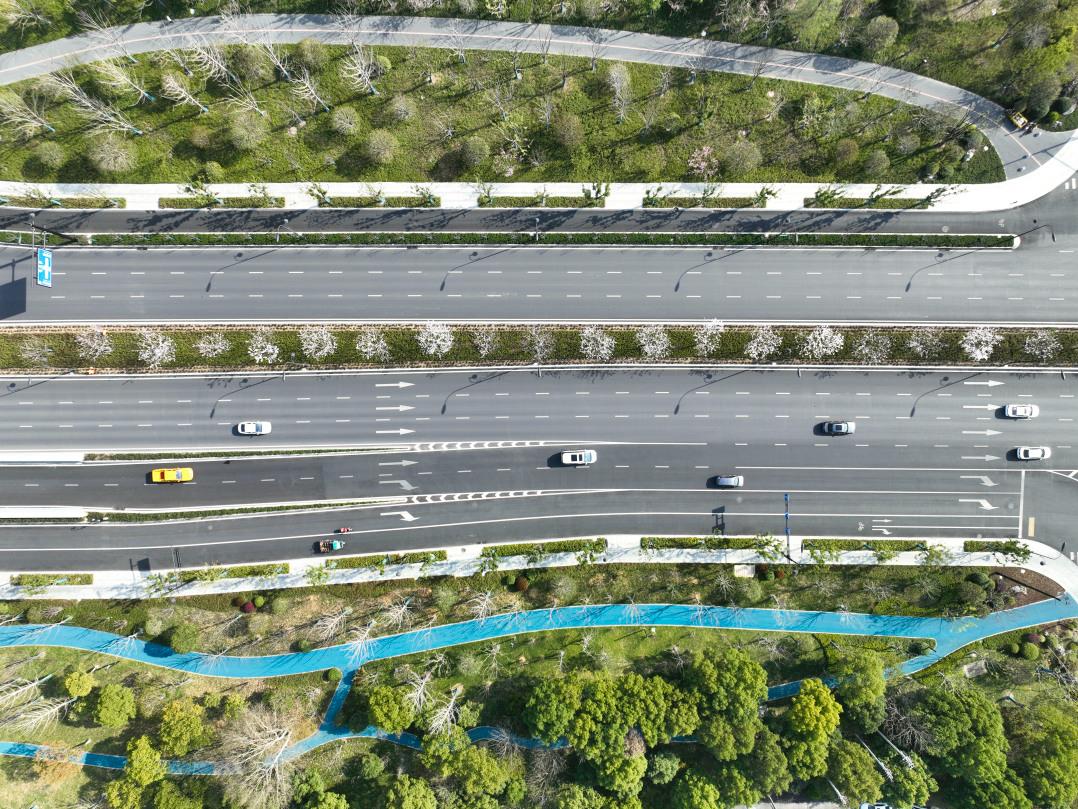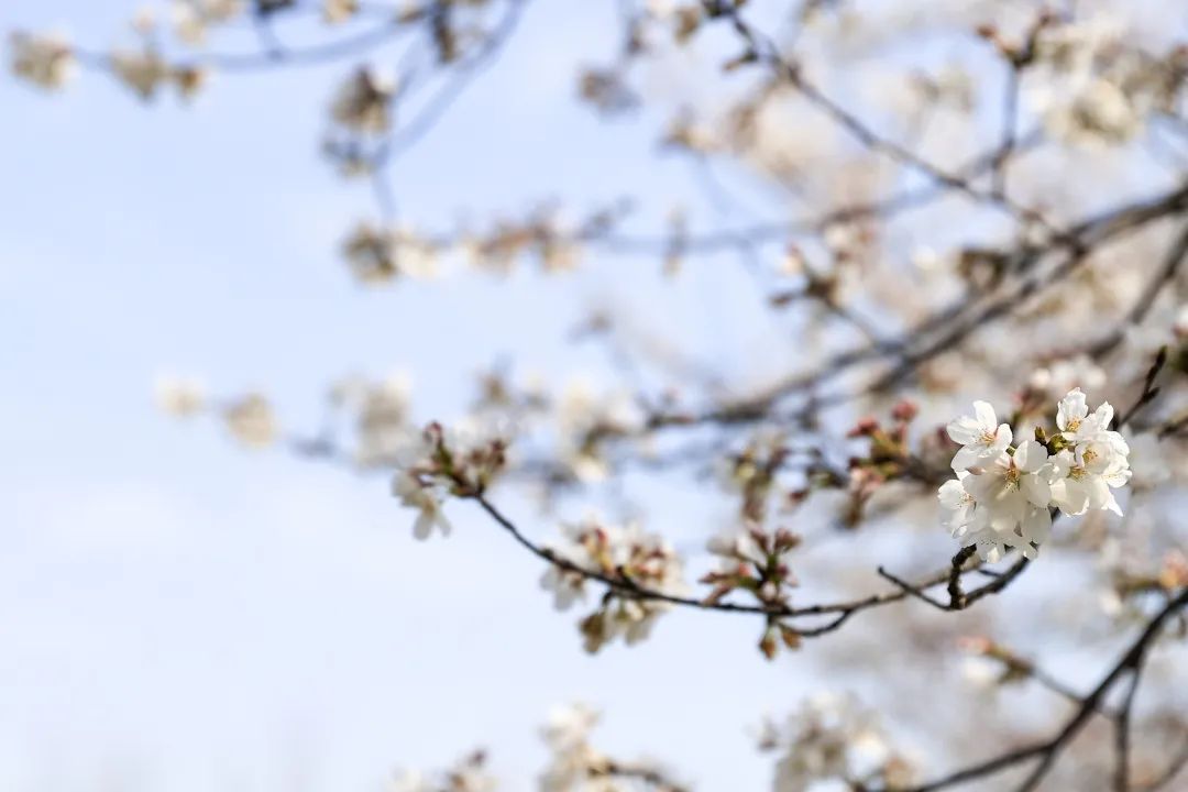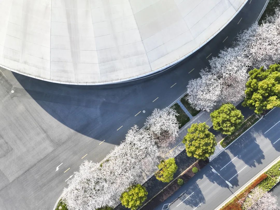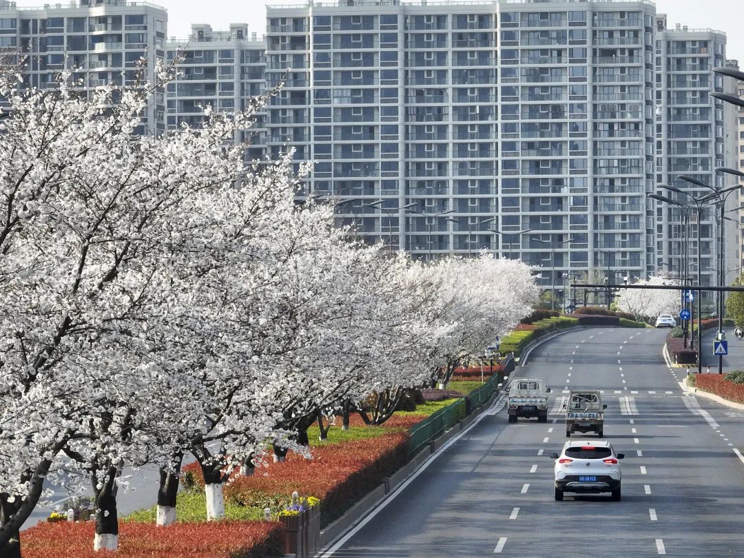 焕新后的文一西路迎来了第一个春天,“车行樱花雨”的美景就在此时。三月中旬,正是樱花开得最热闹的时候。和煦的春光下,微风轻轻吹过,或白或粉的娇嫩花瓣随风起舞,堆云叠雪,满树烂漫。