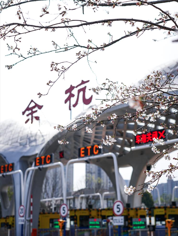 杭徽高速余杭入城口在杭徽高速余杭入城口,道路两侧不少樱花树已竞相开放。收费站大棚掩映于花林之中,形成入口迎宾之势。