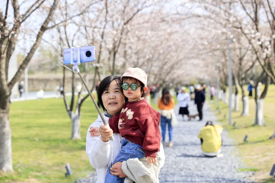 携子扶老,倚伴牵宠,游客或坐在草坪上休憩,或持自拍杆定格美好。在这里,目之所及,皆是浪漫,游人漫步樱花“云廊”,纵享人间雅致。