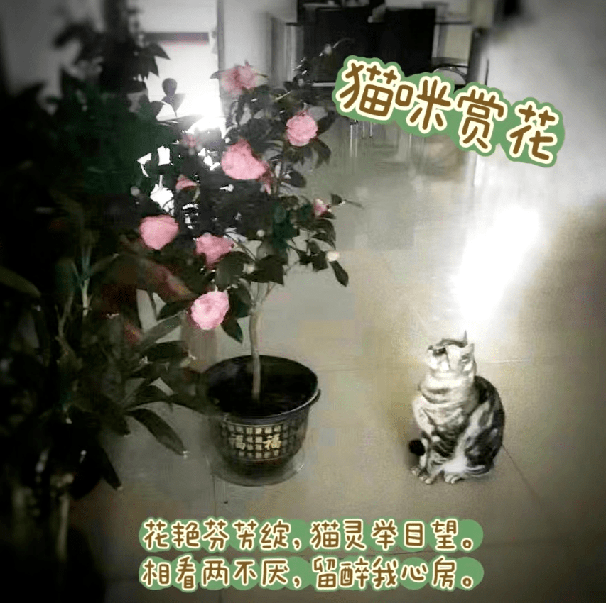 某天上午,我看见猫咪端端正正地坐在地板上,抬头举目,静静地久久地观赏着茶花,享受着花的美丽与芬芳。猫放松的姿态与专注好奇的目光,十分可爱,深深打动着我!猫咪与鲜花,我与猫观花之妙景,相看两不厌。我立刻用平板电脑拍摄下这幅实景美画,感觉非常和谐,十分满意,我通过微信发给大家分享。猫原来的主人北京的孙儿说:“这张照片好神奇哟,拍得好”;老年大学的同学说:“猫有灵性、观花的模样生动有趣、逗人爱”;在加拿大多伦多投靠女儿养老的老同学说:“我特别喜欢猫观赏花的神态,好乖哦”;微信朋友说:“您与猫儿一样幸福”,说出了我的心里话。得到大家的认可,我非常惬意,乐在心头,笑在脸上,栽花与养猫的乐趣,我才疏学浅,不知用什么文字语言表达。