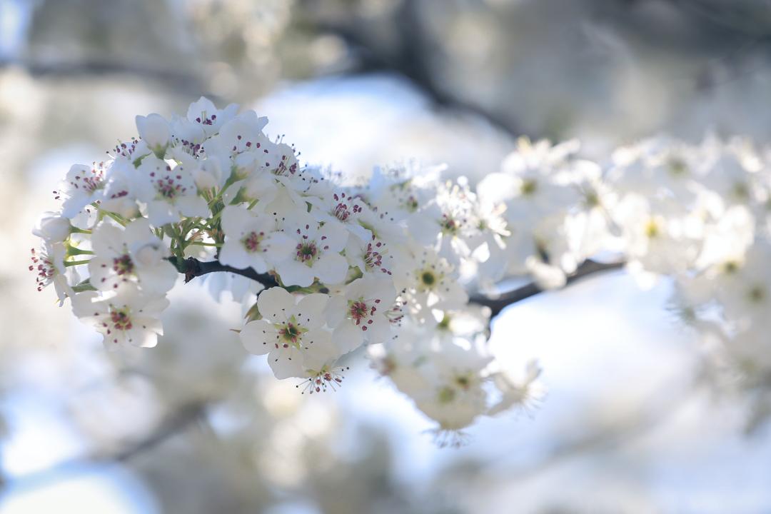 豆梨,梨属落叶乔木,花白色,排列为伞形花序,花后可结出球形梨果,个头不大,直径约1厘米。因其果小如豆,故得名豆梨。辰山植物园春景园内种植了多个观赏性较强的豆梨品种,如‘贵族’、‘勇士’、‘红塔’、‘公鸡’等。目前正处盛花期的豆梨,花开繁密,景致颇为壮观。