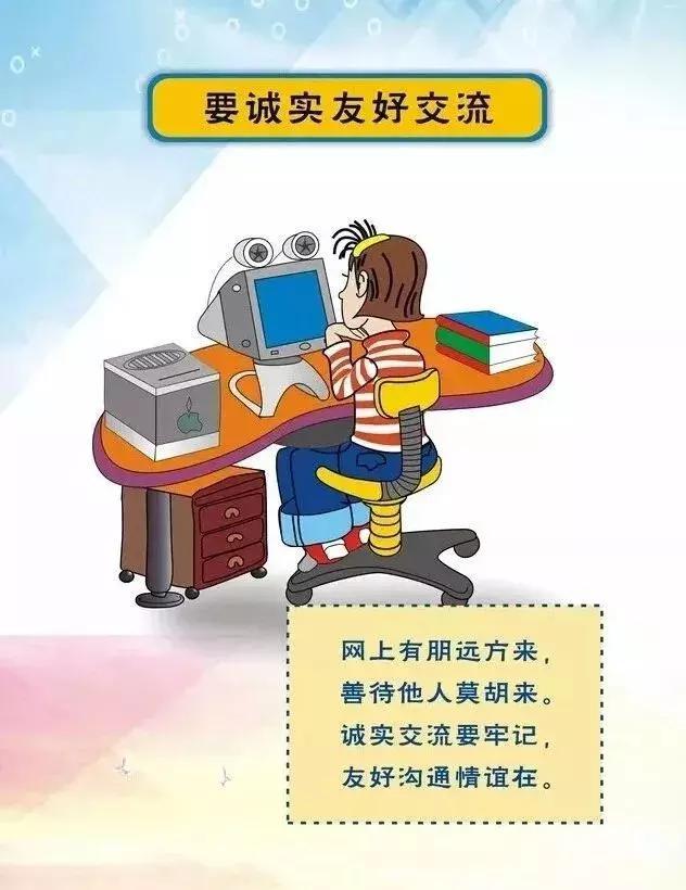 不要透露有关家庭的任何资料,包括姓名、地址、电话等;不要轻易相信别人;在没有得到父母的同意前,不要约会网上的朋友;不要与日俱增恶意挑衅;不参与不良的网上游戏等。遇到令自己不适的信息时,不要回复并马上告诉父母和老师。