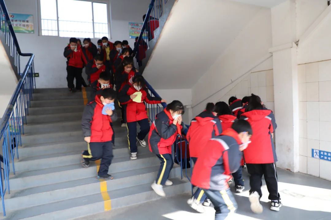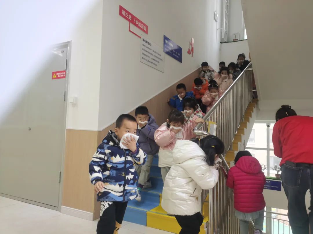 在随后开展的火灾应急演练中,各班老师听到警报声后,冷静应对突发情况,按照所学所练的消防知识,沿着紧急疏散路线,带领小朋友们捂住口鼻,弯腰小步快速有序地从教学楼撤离到安全地带,成功完成演练。