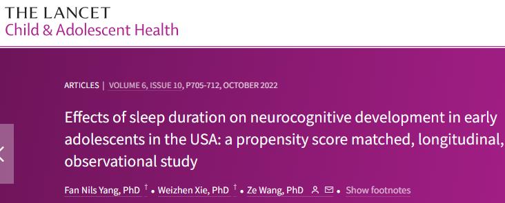 近日,美国马里兰大学医学院、国立卫生研究院的研究人员在《柳叶刀》子刊" The Lancet Child & Adolescent Health "上发表了一篇题为" Effects of sleep duration on neurocognitive development in early adolescents in the USA:a propensity score matched,longitudinal,observational study "的研究论文。