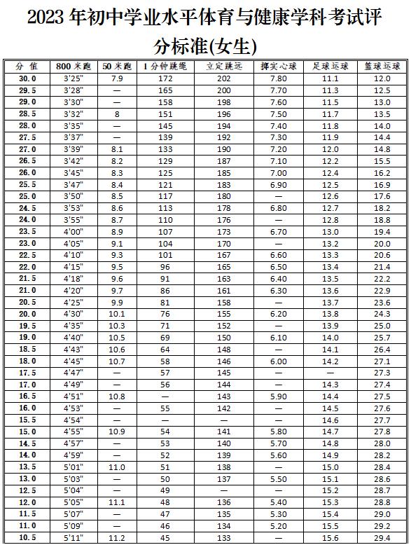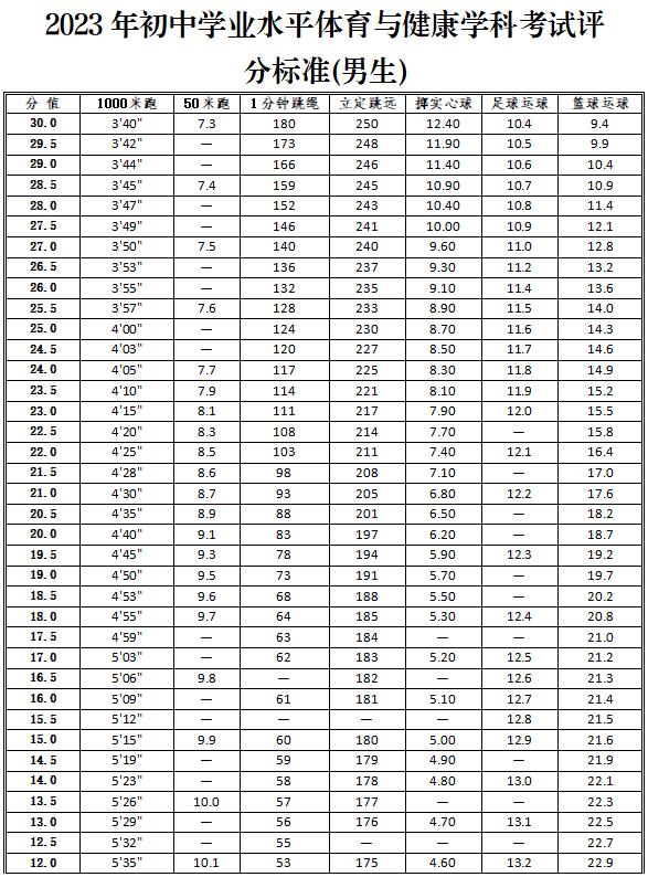 考试项目评分按照《国家学生体质健康标准(2014年修订)》中“初中三年级相关项目评分标准”执行;对于一分钟跳绳等没有收录的选考项目,将参照教育部、国家体育总局2007年颁布施行的《国家学生体质健康标准》中“初中三年级相关项目评分标准”执行。足球运球项目评分参照教育部《学生足球运动技能等级评定标准》执行。