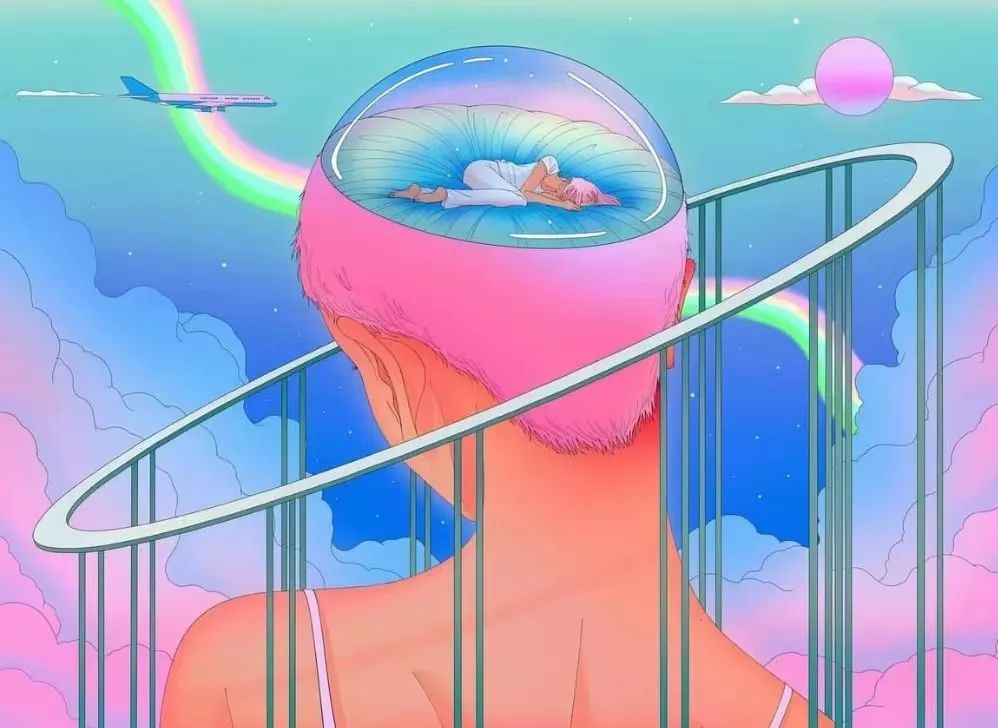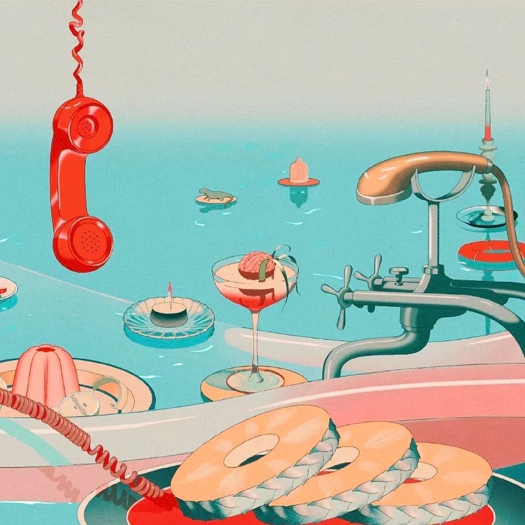 每个插画作品的主题都异想天开,让人琢磨不透又充满好奇。通过不同的几何图形、绮丽的科幻色彩和粗糙颗粒肌理,呈现出迷幻复古又新潮的视觉感受。