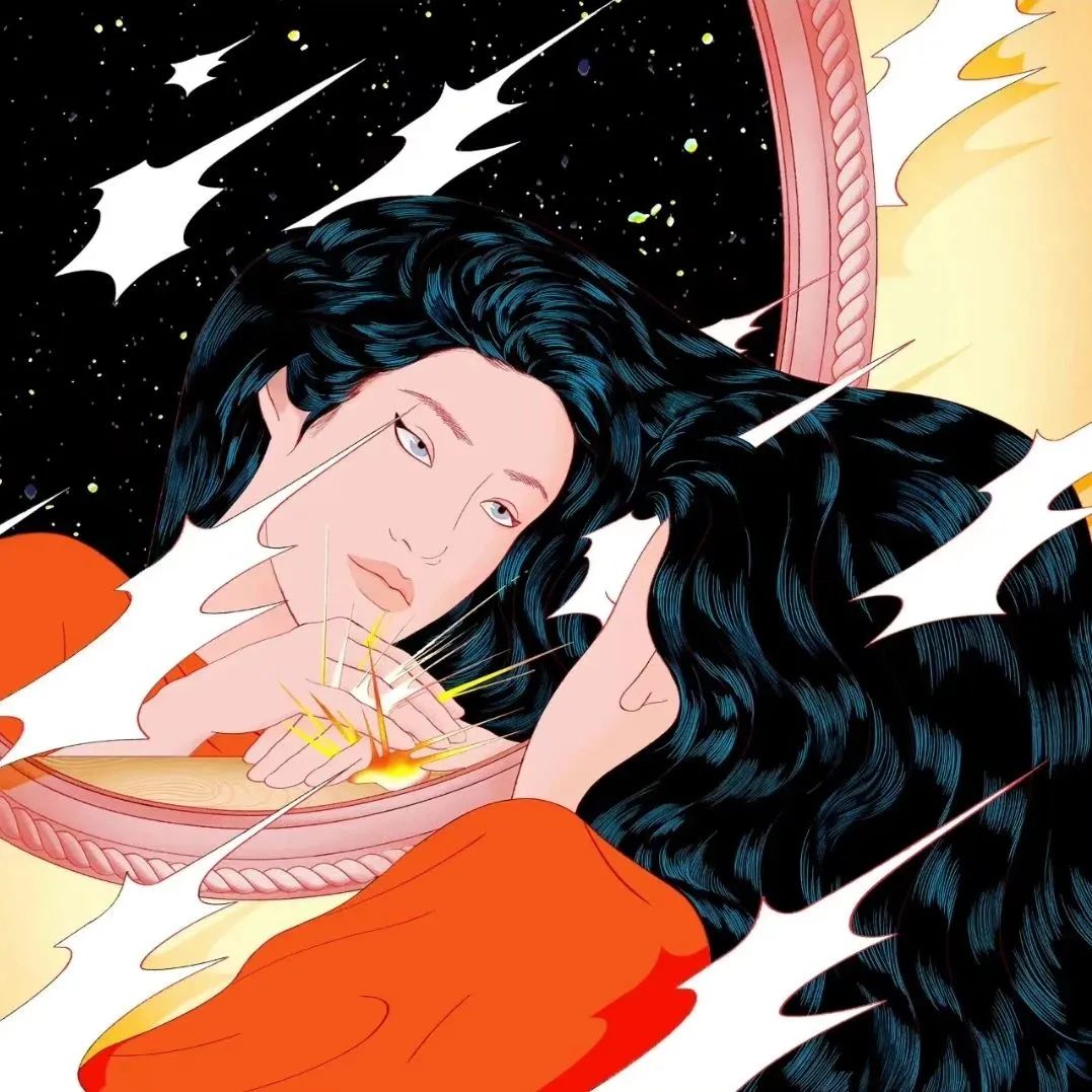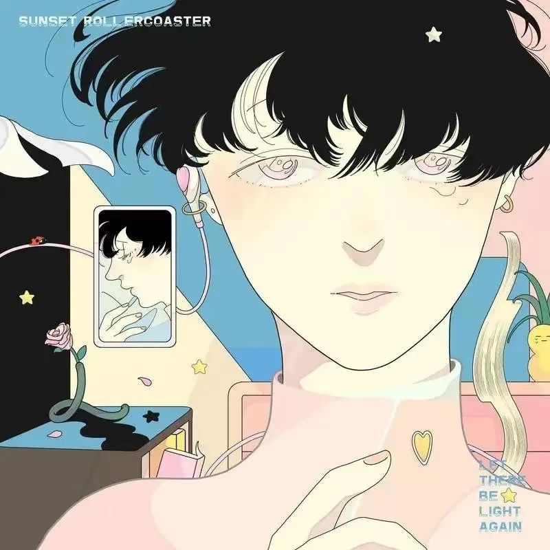 落日飞车《Let There Be Light Again》模糊性别的人物,彩色的瞳孔,飘逸的头发,搭配水珠、羽毛、星辰,呈现出一种破碎感。