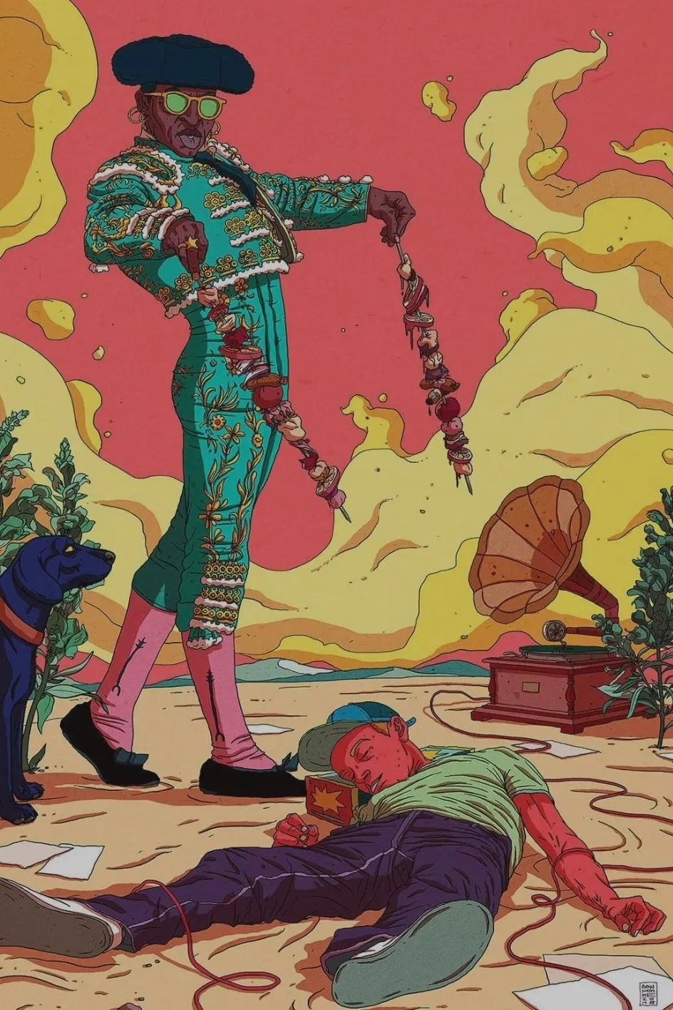 他的每幅作品都有讽刺意味,不仅画面用色大胆,充满魔幻感,其背后的意义也引人深思。