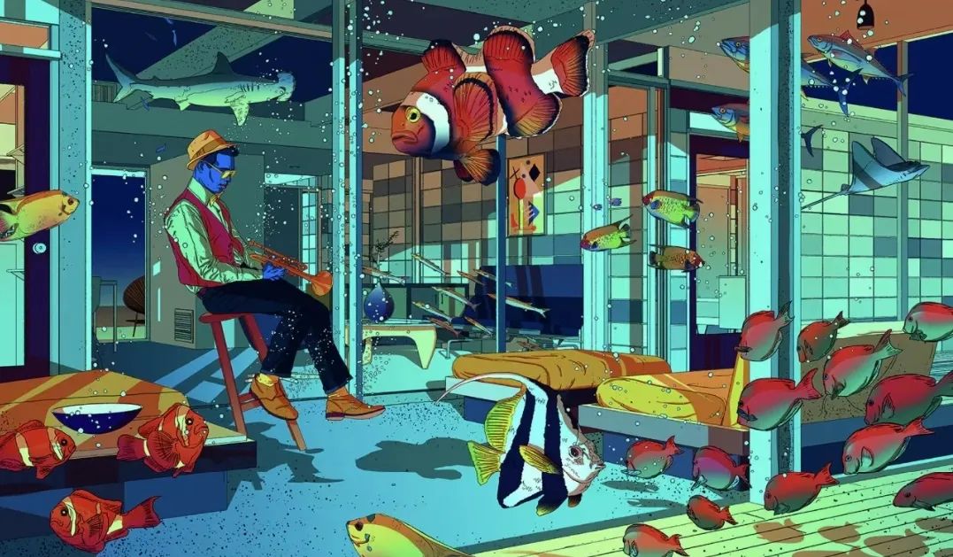 除了插画师的身份,他还是一个爵士乐迷,演奏了近20年的萨克斯管,所以爵士乐的元素他画起来也得心应手。