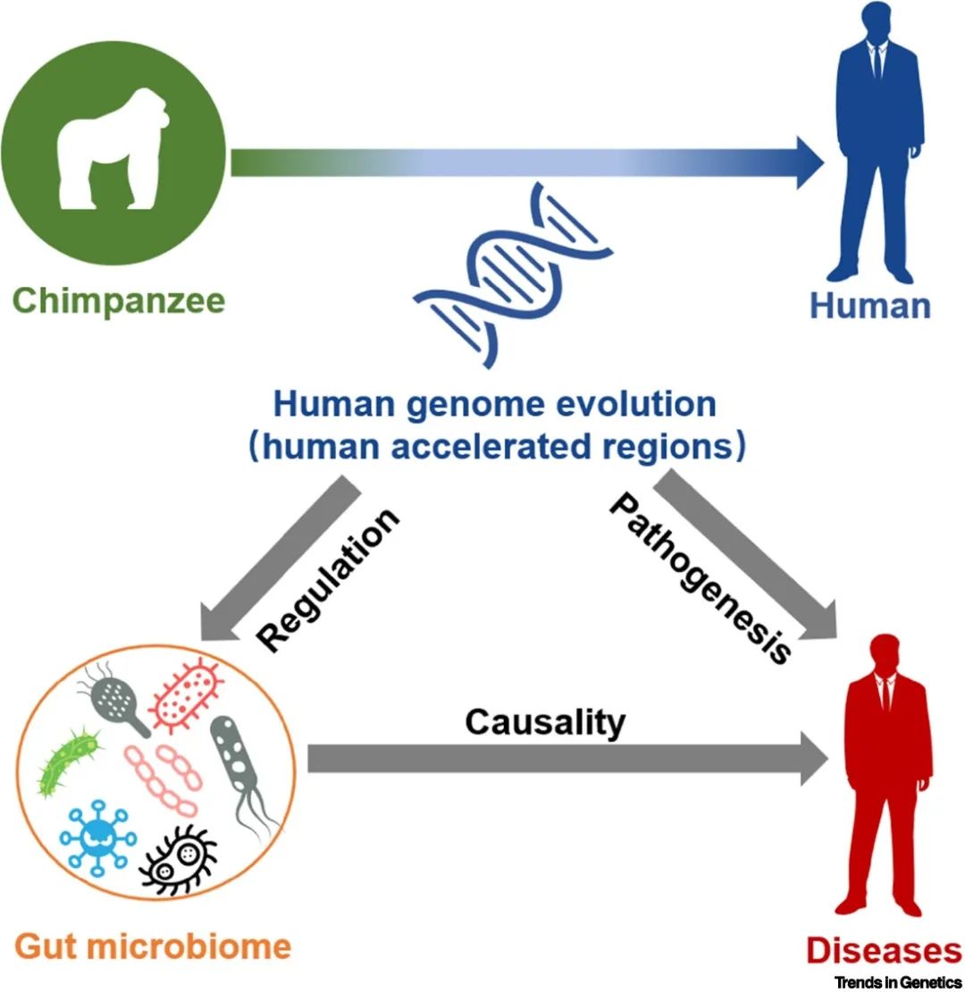多项实验研究证实了HARs调节的肠道微生物与几种疾病之间的因果关系[4]。特别是,这些HARs靶向的遗传因子和HARs调节的肠道微生物都与人类特有疾病有关[4]。因此,有理由认为这些肠道微生物可能在与HARs相关的人类特有疾病的发病机制中发挥重要作用。更有趣的是,自从人类与黑猩猩分化以来,上述可被HARs调节的5种肠道微生物(即拟杆菌属、双歧杆菌属、小类杆菌属、胆型螺旋杆菌和罗伊氏乳杆菌)的相对丰度发生了快速变化[19]。因此,作者推测HARs可能与肠道微生物群形成共同进化单元,从而影响人类健康。考虑到肠道微生物群与人类特有疾病之间的因果关系,作者提出了肠道微生物群是将疾病与人类基因组进化联系起来的重要媒介的观点。