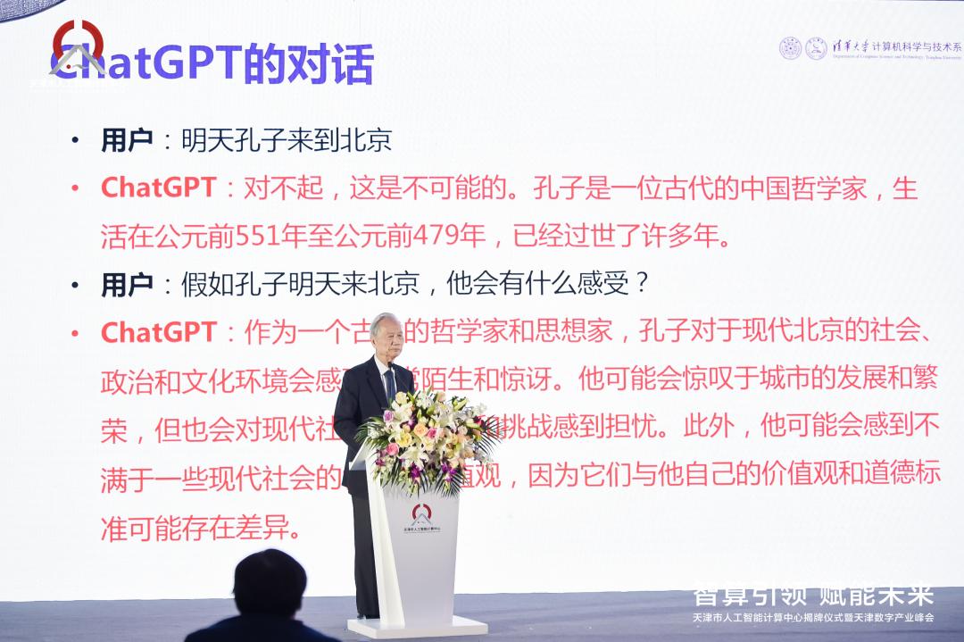揭牌仪式上,中国科学院院士、清华大学人工智能研究院名誉院长张钹在演讲中,用最近火爆的OpenAI聊天机器人ChatGPT举了一个有趣的例子——