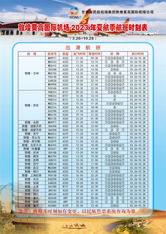 敦煌莫高国际机场夏航季出港航班时刻表