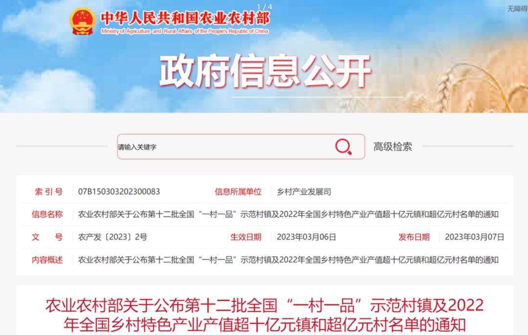 近日,农业农村部网站发布《农业农村部关于公布第十二批全国“一村一品”示范村镇及2022年全国乡村特色产业产值超十亿元镇和超亿元村名单的通知》。其中,无为市红庙镇海云村(牡丹)入选第十二批全国“一村一品”示范村镇名单,南陵县许镇镇(鳙鱼)入选2022年全国乡村特色产业产值超十亿元镇名单,湾沚区六郎镇北陶村(休闲旅游)、无为市红庙镇海云村(牡丹)入选2022年全国乡村特色产业产值超亿元村名单。