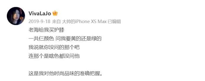 一次,海一天买了3种颜色的护膝,兴冲冲地问,“老婆,你是要黄的还是要绿的?”