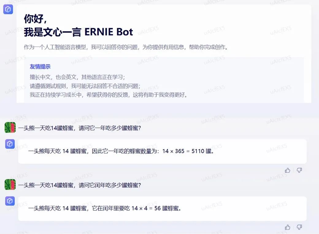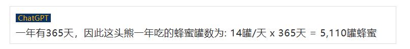 问:一头熊一天吃14罐蜂蜜,请问它一年吃多少罐蜂蜜?文心一言:14×365=5110 罐。