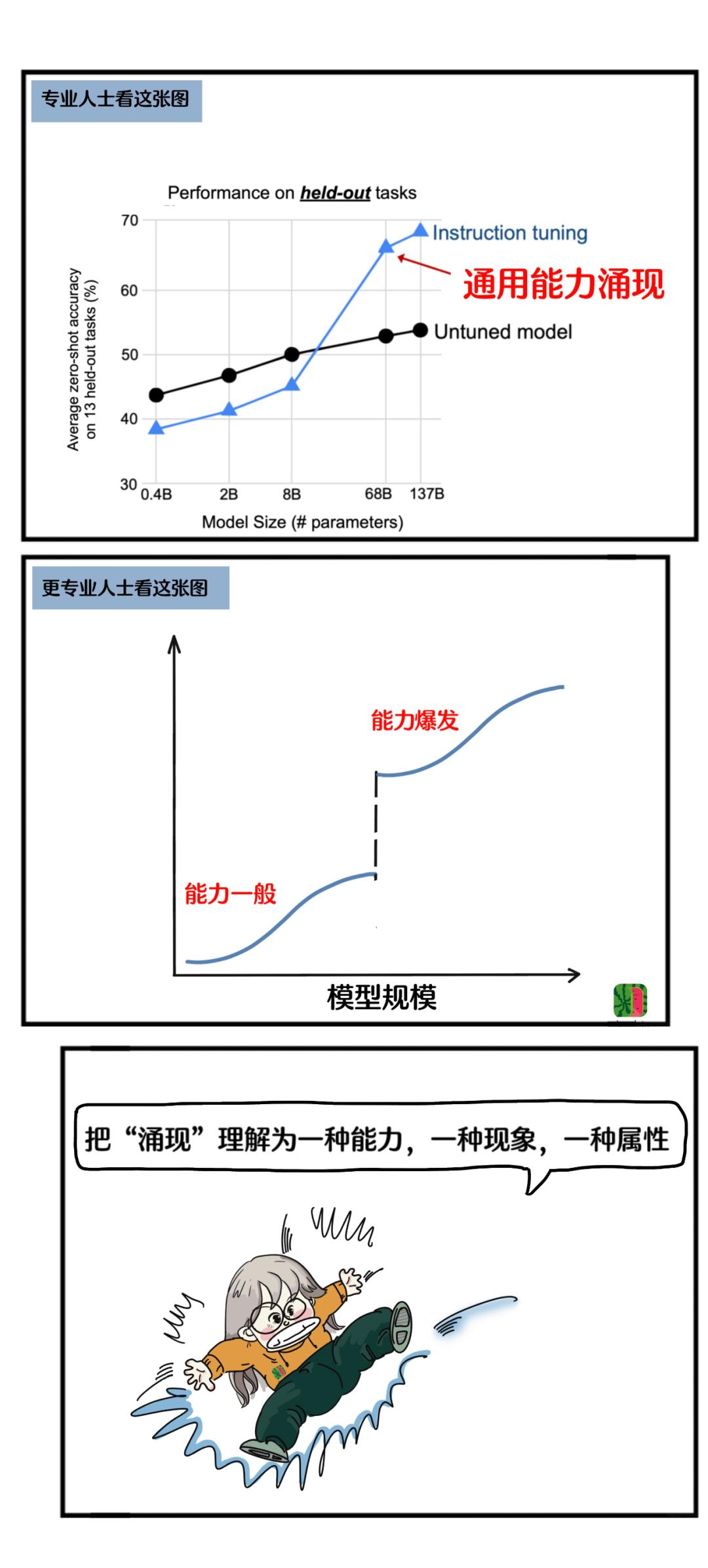 但是,当模型超过某个规模之后,性能突然就上去了,这就是“涌现”。