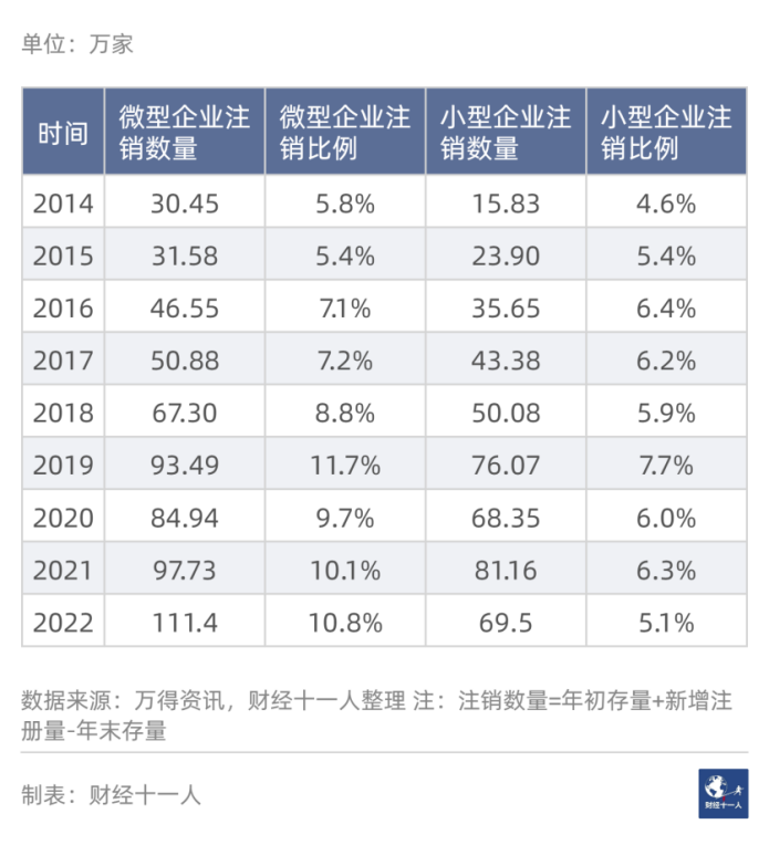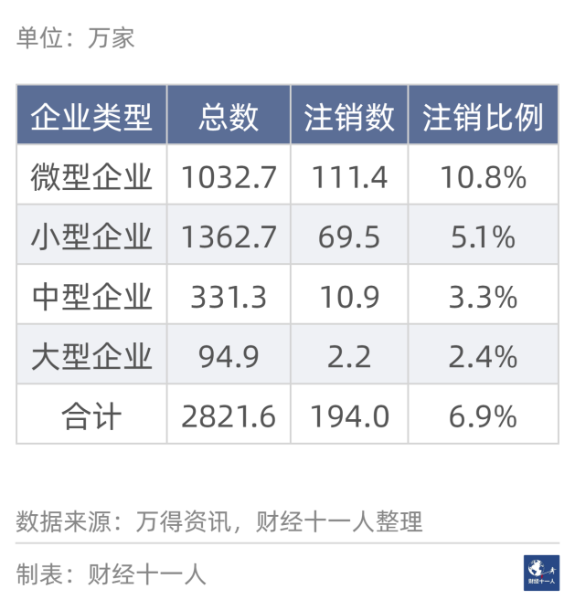 而小型和微型企业的总注销数量占所有注销企业的93%以上【(111.4+69.5)/194=93.3%】。