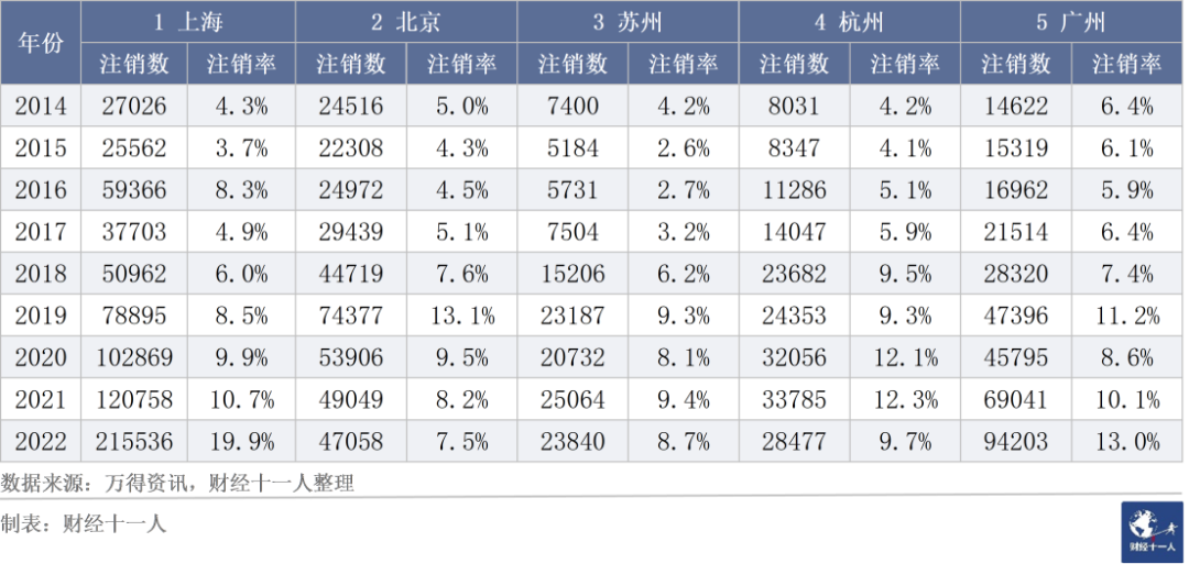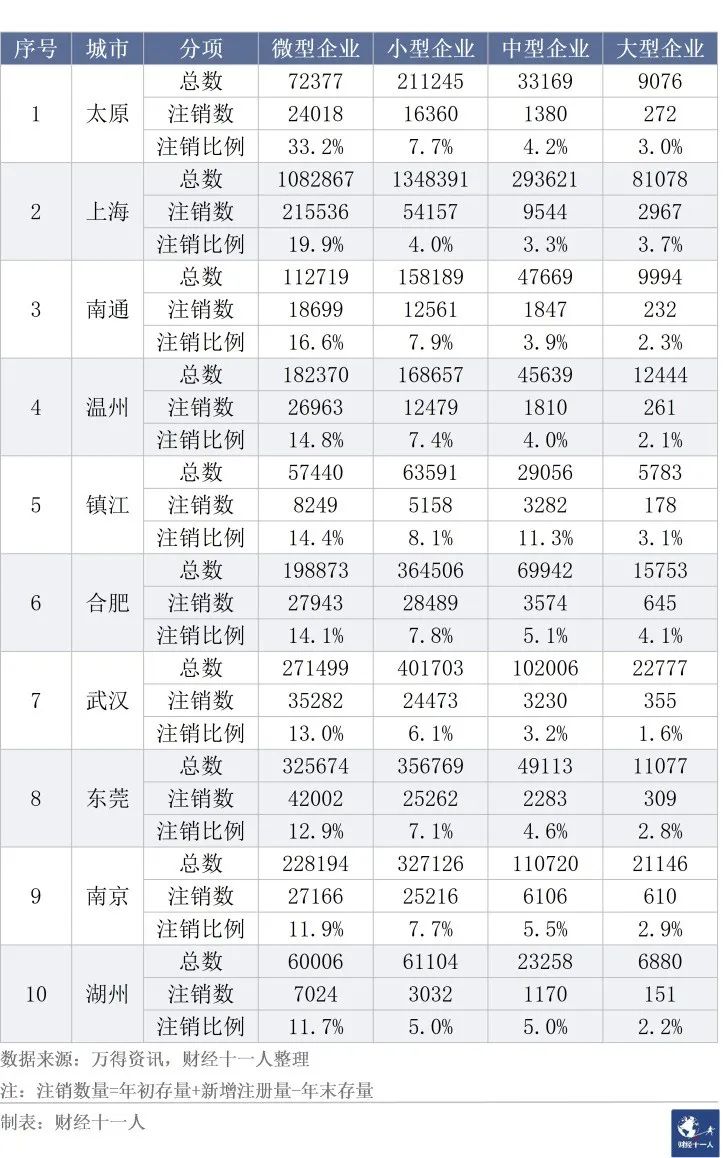 在这10个城市,虽然微型企业的注销率都超过了11%,但大型和中型企业的注销率很少超过5%。