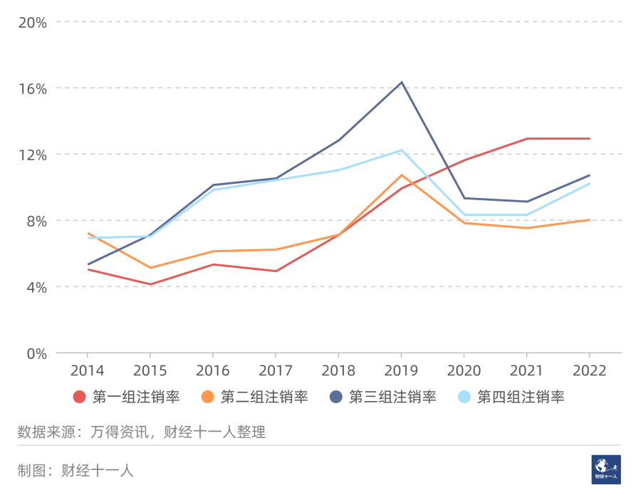 图3: 2014年-2022年第1到第4组城市的微型企业注销率