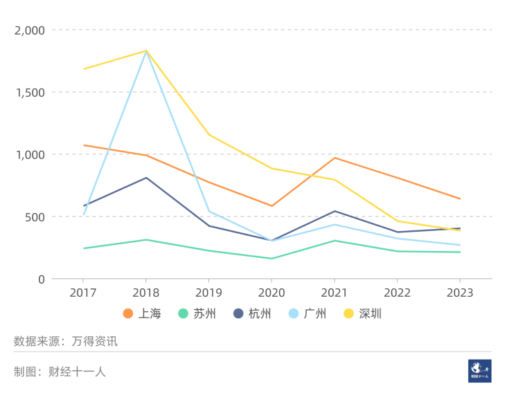 北上广深苏杭是中国经济最强的六个城市。目前北京的数据还没有更新,我们看看其余五个城市的数据。图4是上海、广州、深圳、苏州、杭州各年1月和2月累计新增大型企业的数量。