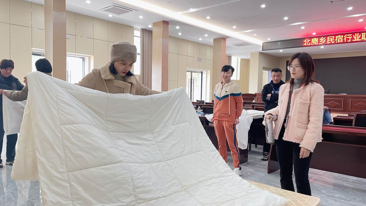 近年来,随着全域旅游发展,北麂乡从昔日的“小渔村”变成大众旅游打卡的目的地,当地民宿行业也迎来发展机遇。此次培训,针对海岛民宿的实际需求,通过理论与实操相结合的方式,开设中式铺床、北麂岛旅游线路设计、民宿早餐创意菜单、安全教育等课程。