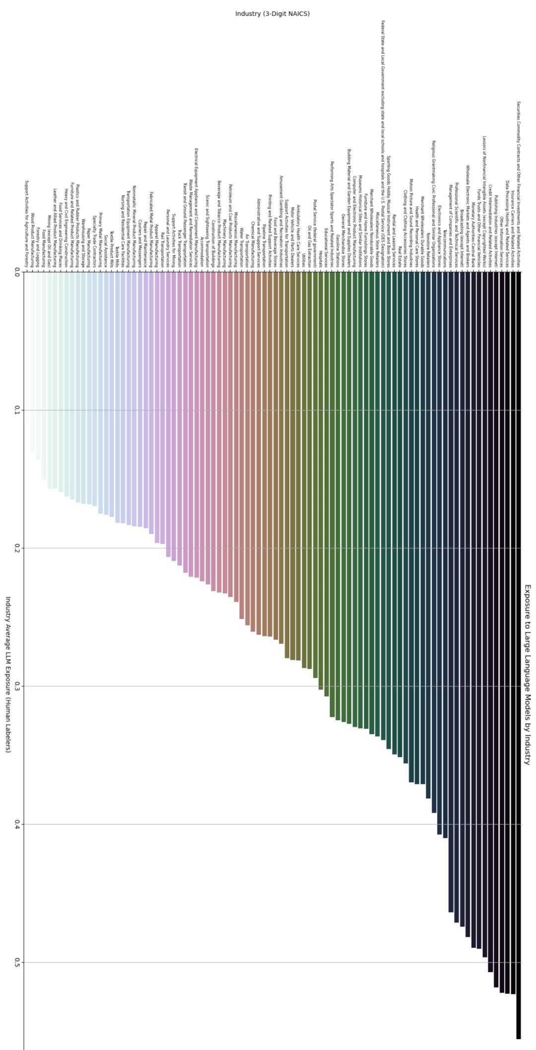 该研究还按行业细分了 ChatGPT 的影响。数据处理托管、出版业等行业最有可能受到影响。相比之下,体力劳动较多的行业 —— 食品、林业、社会援助等受到的潜在影响最小。
