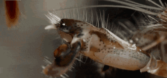 这道高速水流触发空穴现象,形成一个极微小的低压气泡,当水压恢复正常,气泡崩裂并发出“噼啪”的声音,就像开枪一样。由于如此“不同凡响”,鼓虾还另有枪虾、嘎巴虾、咔嗒虾、乐队虾等名号。据说,成群的鼓虾在海床上聚集所发出的噪音,甚至能够干扰军舰的声呐探测器。