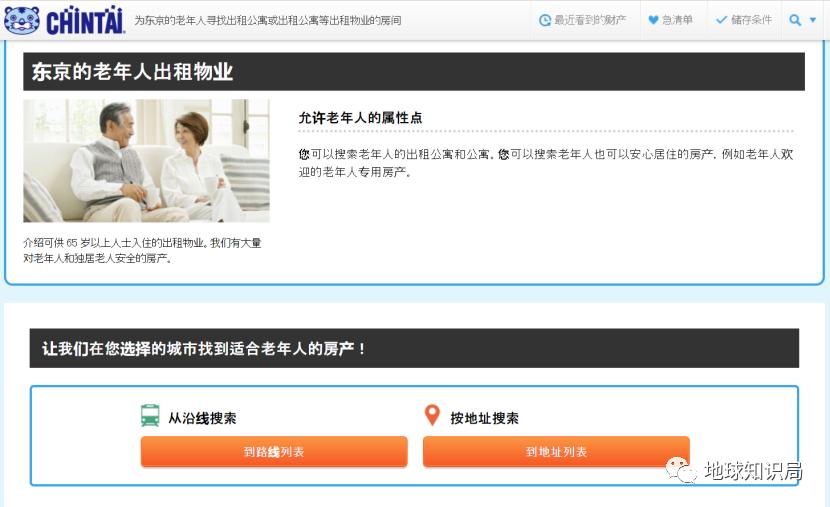 而近年来独居老人的问题,也得到了一定关注,在日本CHINTAI等租房网站上,也设置有老年人公寓页面,供用户选择。老人太多,房屋租赁市场自然细分出这块服务